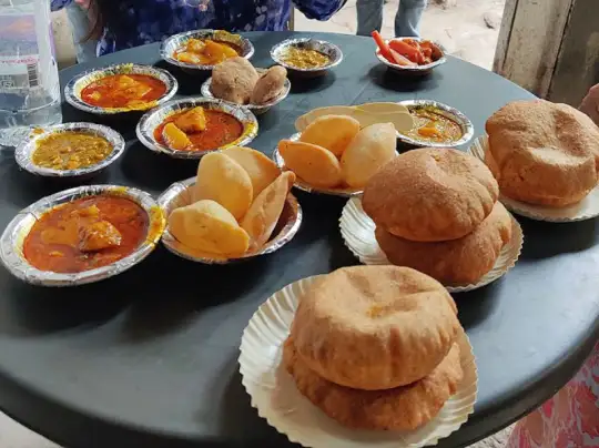 Treat yourself to deep-fried bread served with spicy potato curry.