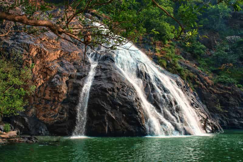Majestic cascade amidst verdant forests. A thrilling trek awaits amidst monsoon mist.